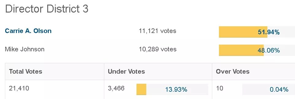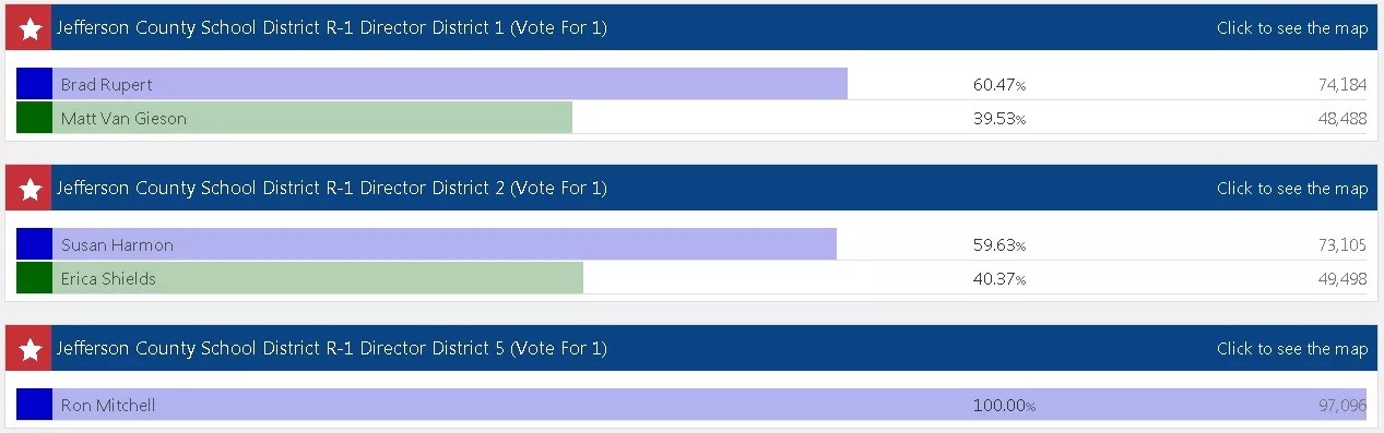 A similar turnover in school-board ideology took place in Jefferson County circa 2015. Yesterday, two of the boardmembers under the Keep Jeffco Moving Forward umbrella – Brad Rupert and Susan Harmon – handily won reelection, and their cohort, Ron Mitchell, ran unopposed. The numbers are as follows.