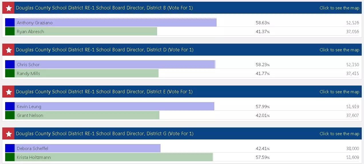 Other major school-board face-offs took place in Douglas County and Jefferson County. Voters in DougCo cast their lot with four candidates – Anthony Graziano, Chris Schor, Kevin Leung and Krista Holtzmann – who oppose the voucher system pushed by previous electees. Their wins will almost certainly lead to a huge shift in position for the board as a whole.