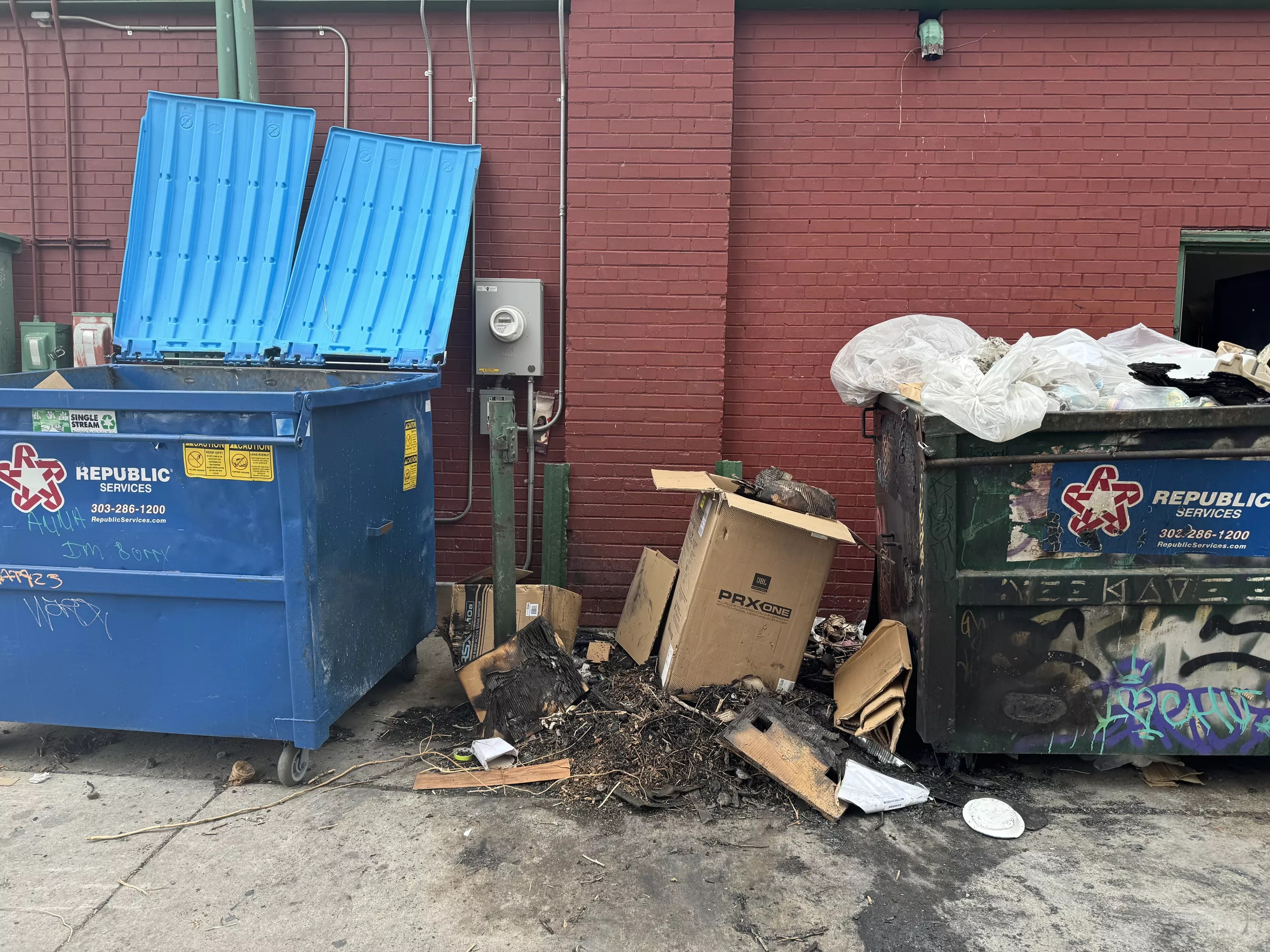 Aftermath of the dumpster fire at the Mercury Cafe, now known as the Pearl.