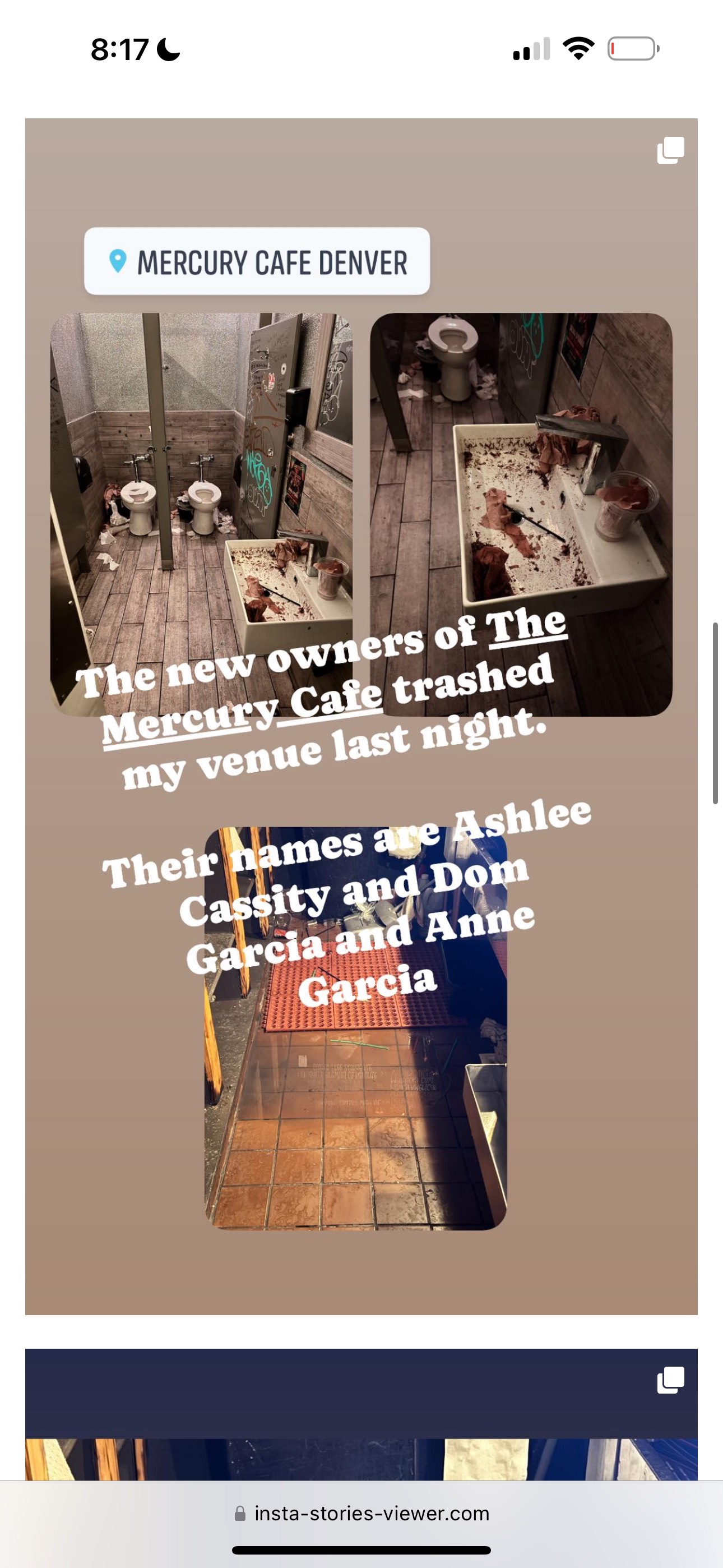 The next day, Johnson posted photos on social media along with the full names of Cassity and both Garcias while tagging Mora and the Mercury Cafe, saying the future owners of the Merc had trashed her bar. “They deserve that,” Johnson says. “I’m not going on to social media to cancel anybody. I’m just stating truths. I’m stating pictures and the videos that we have when we walked into the venue, when we were trying to be amicable and professional, and they trashed it.”
