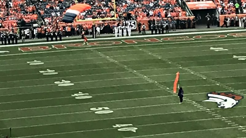 A member of Denver Broncos Thunderstorm sails onto the field prior to an appearance by the other type of thunderstorm.