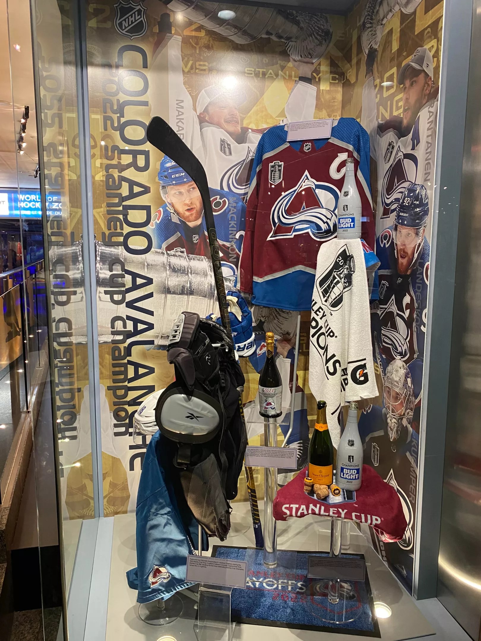 A display at the Hockey Hall of Fame paying tribute to the 2022 Stanley Cup champion Colorado Avalanche.