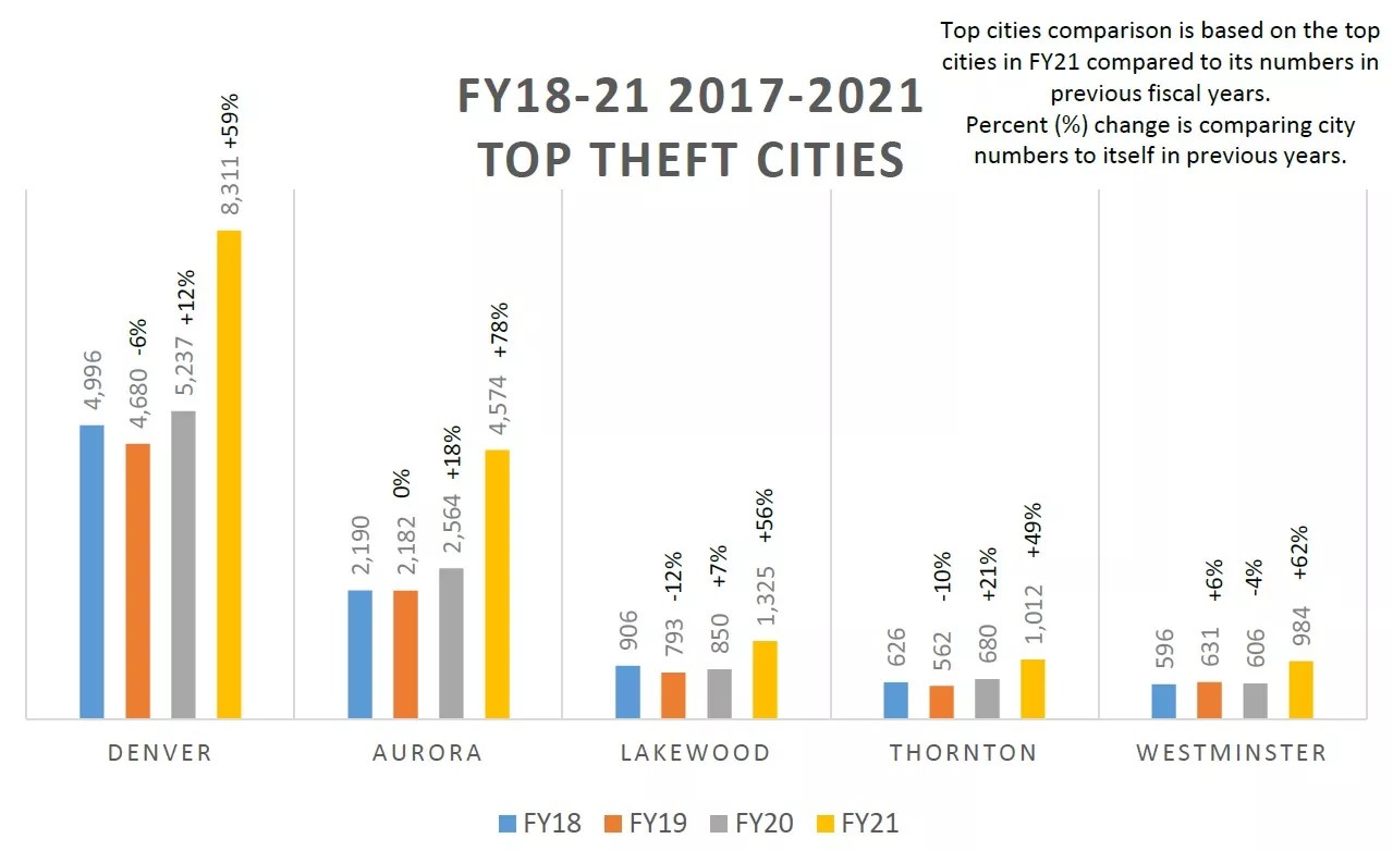 Here’s a graphic showing the jump in car thefts in five cities — Denver, Aurora, Lakewood, Thornton and Westminster — from 2018 to 2021.