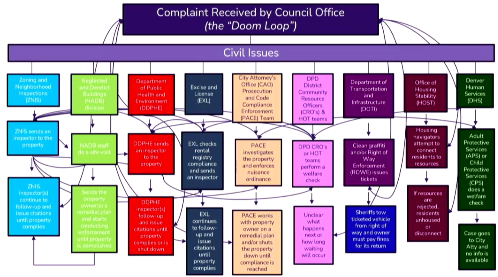The Department of Community Planning & Development oversees Denver’s neglected and derelict building registry, the Denver Department of Public Health & Environment is in charge of potential health issues, the Department of Excise & Licenses can get involved if the property is being rented out, and the Denver Police Department’s community resource officers are in charge of wellness checks. And that lineup doesn’t begin to cover every agency that can be part of the doom loop, according to Sawyer, whose staff worked to identify nine city agencies that regularly interact with problem properties.