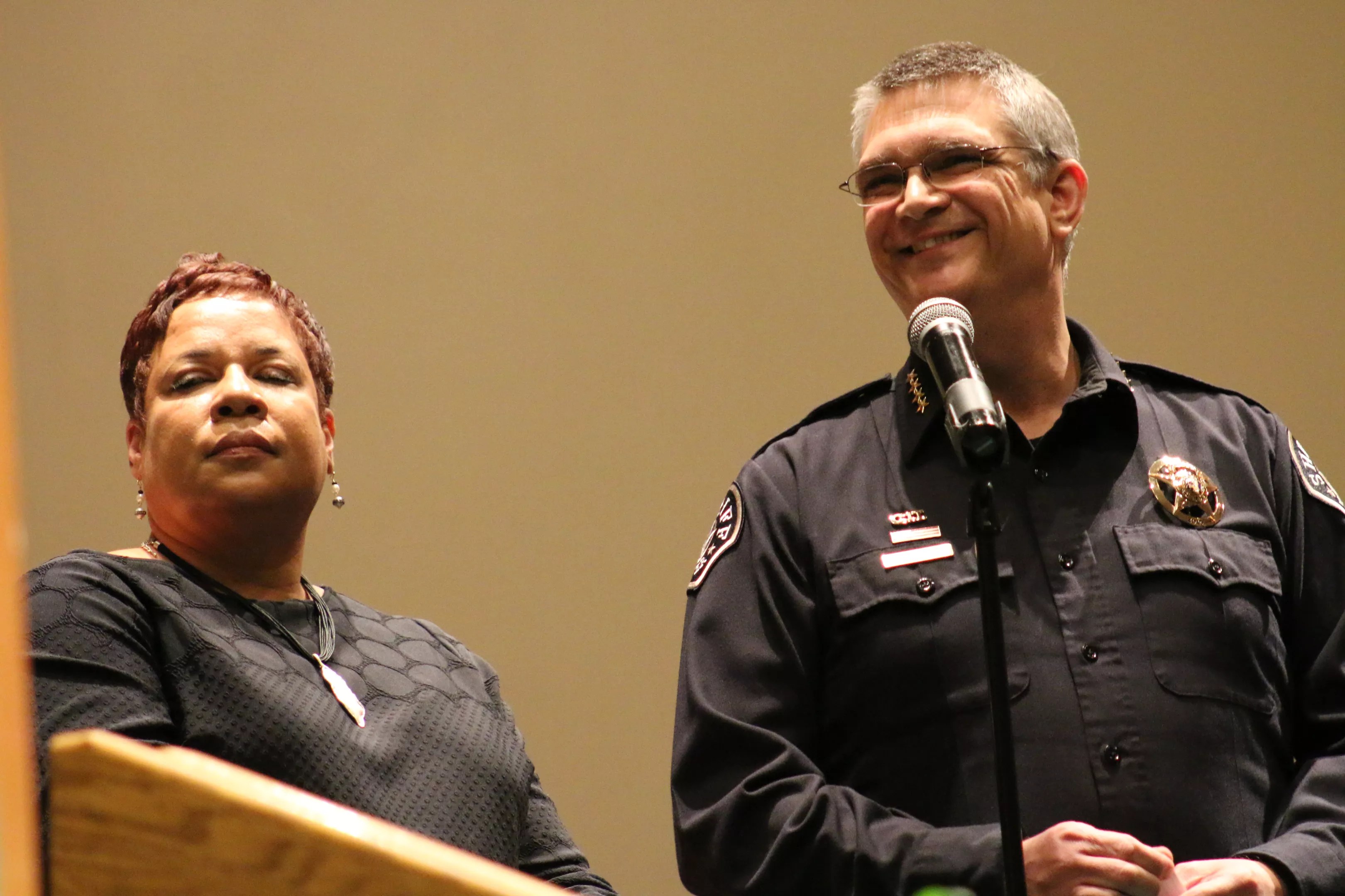 She invited Chief White to the stage first. As he walked up, she described a meeting she’d had with him earlier in the afternoon, in which she and others expressed a desire to have a transparent, ongoing relationship with him. They’d talked about strengthening trust and building relationships. “We are hopeful we are able to move forward with this,” McNeil said. “So, Chief White, a use-of-force policy has been created without any community input, [and without participation from] the Citizen Oversight Board, the Office of the Independent Monitor, officers and the directly impacted community.”