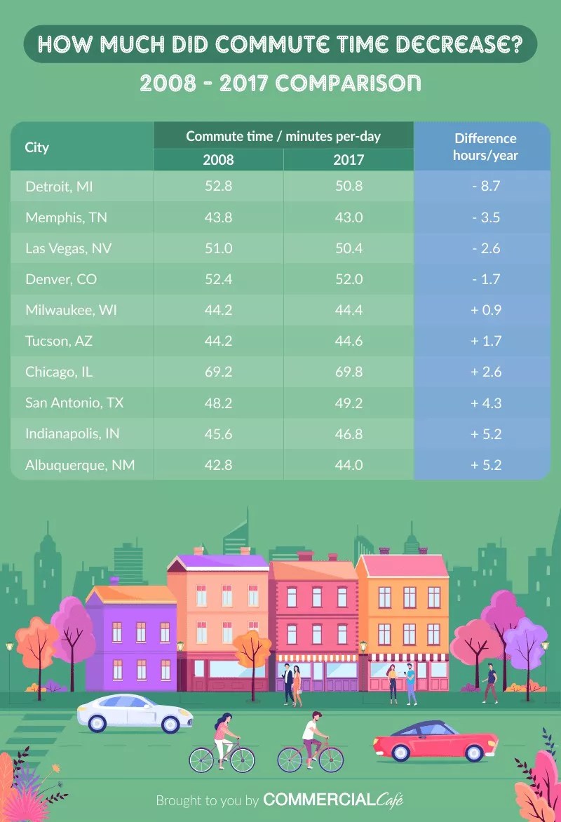 The study shows commute times here shrinking slightly on a daily basis, with the overall savings in time calculated at about 1.7 hours per annum. Only three other major cities – Detroit, Memphis and Las Vegas – had greater (or, in fact, any) decreases, as depicted in the following graphic: