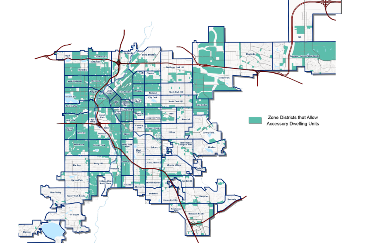 About 35 percent of Denver’s land area allows ADU through local zoning laws, according to a presentation during a March city council meeting. An online city map shows where ADUs are allowed, which is mostly concentrated close to downtown in neighborhoods like Highland, Westwood and City Park West. Patches of ADU-friendly zoning can be found farther from downtown, however, in areas like Central Park, Green Valley Ranch and College View.