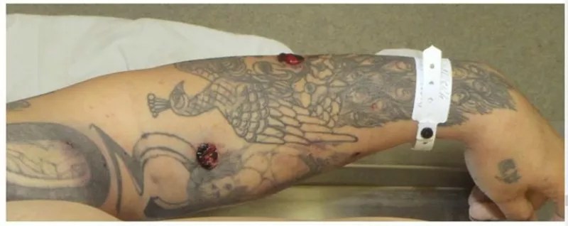 Denver DA Mitch Morrissey used the bullet holes in Dion Damon’s arm, seen in this post-mortem photo, in his decision letter that found Officer Jeffrey Motz’s actions justified.