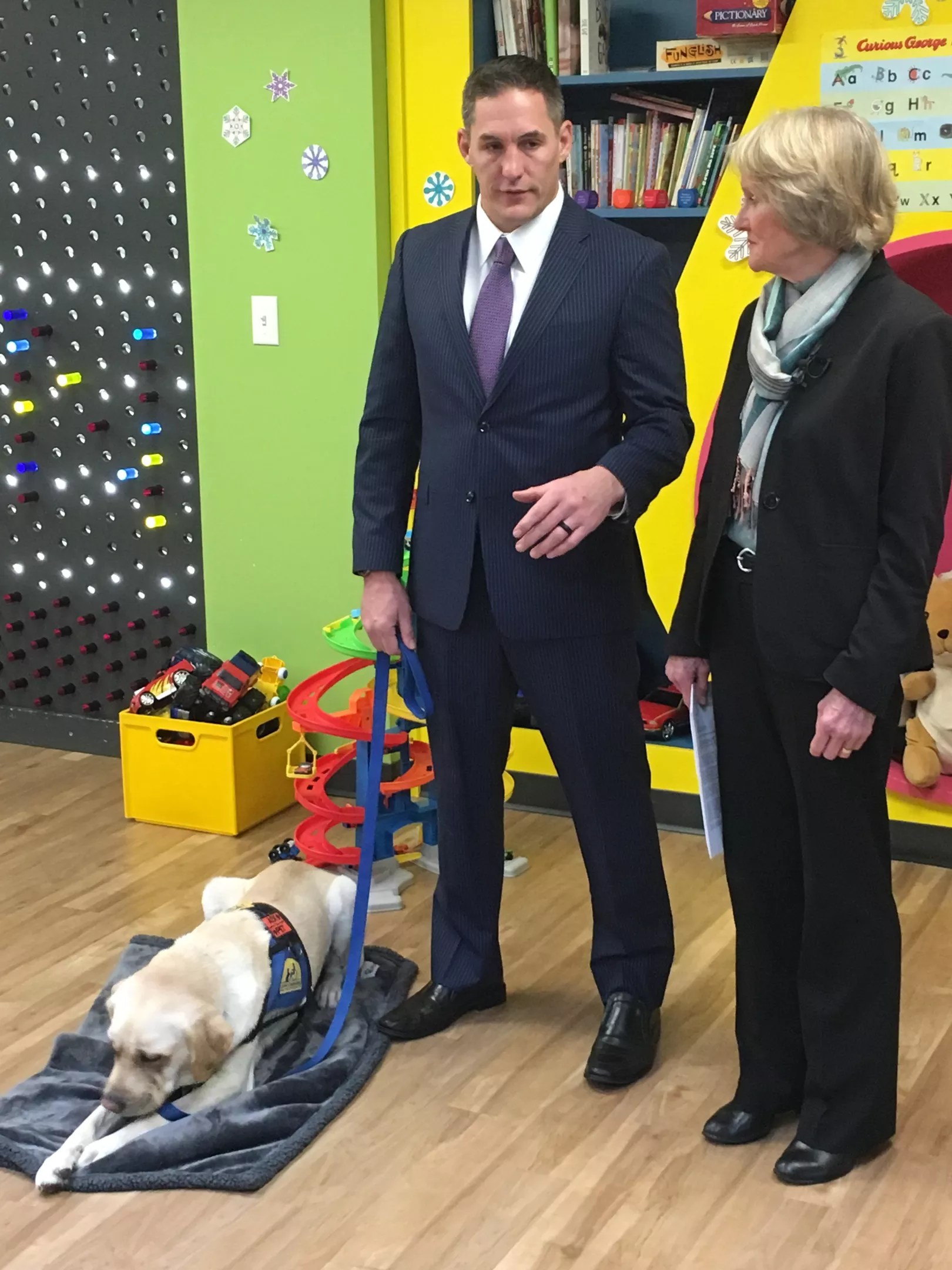 Rylan does not come at any taxpayer expense, McCann adds. The highly trained dog, which is worth about $50,000, was provided for free by the nonprofit organization Canine Companions for Independence. But obtaining Rylan has been a long process. McCann said that when she was elected as district attorney, she already knew that other DAs use canines to help victims of violent or sexual crimes (Arapahoe County and Boulder County have service dogs, for instance), and McCann applied for a dog through Canine Companions for Independence roughly a year and a half ago.