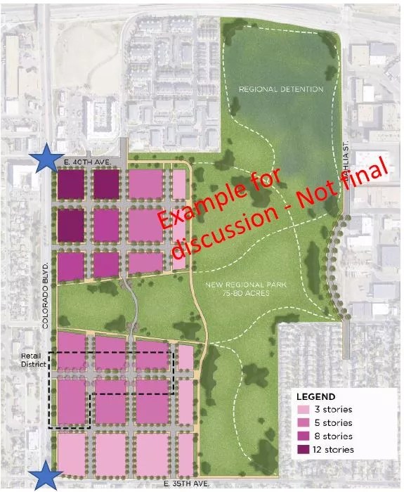 On May 10, members of the Park Hill Golf Course Area Plan steering committee were shown a mock-up of a potential small-area plan, which could guide the city on what type of rezoning might be needed for the site. It showed a mixed-use development on the property along the west side, as well as a retail corridor running along Colorado Boulevard from the south for a few blocks and then jutting inward. There would be residential units throughout this development, with the tallest section — twelve stories — along Colorado Boulevard and East 40th Avenue.
