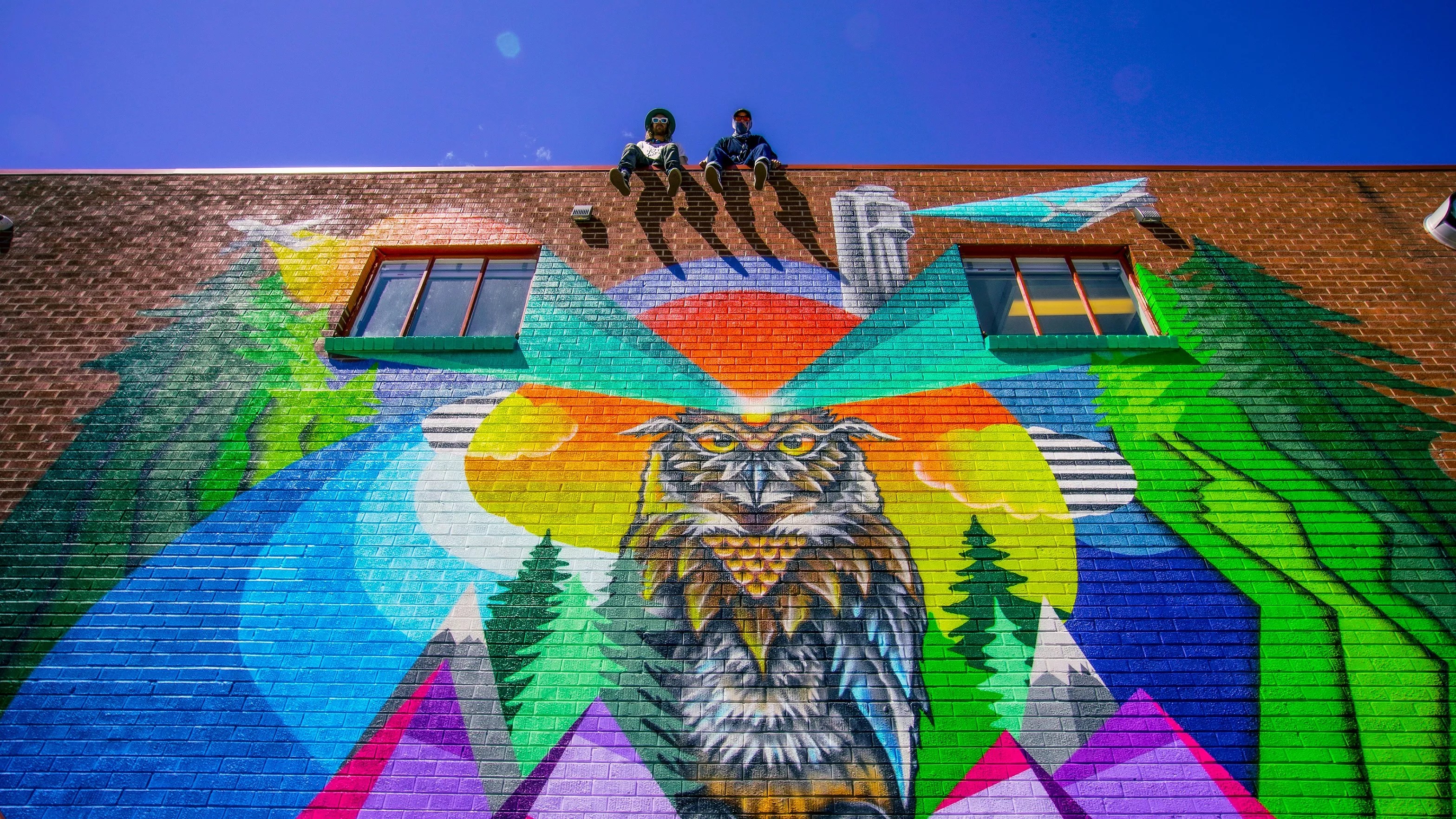 Now, on the side of the old brick building facing the parking lot, there’s a great-horned owl set in front of a geometric landscape of snowy peaks and pine trees. At the top corners of the mural, two planes fly into the distance out of the long-defunct but still iconic Stapleton International Airport control tower.