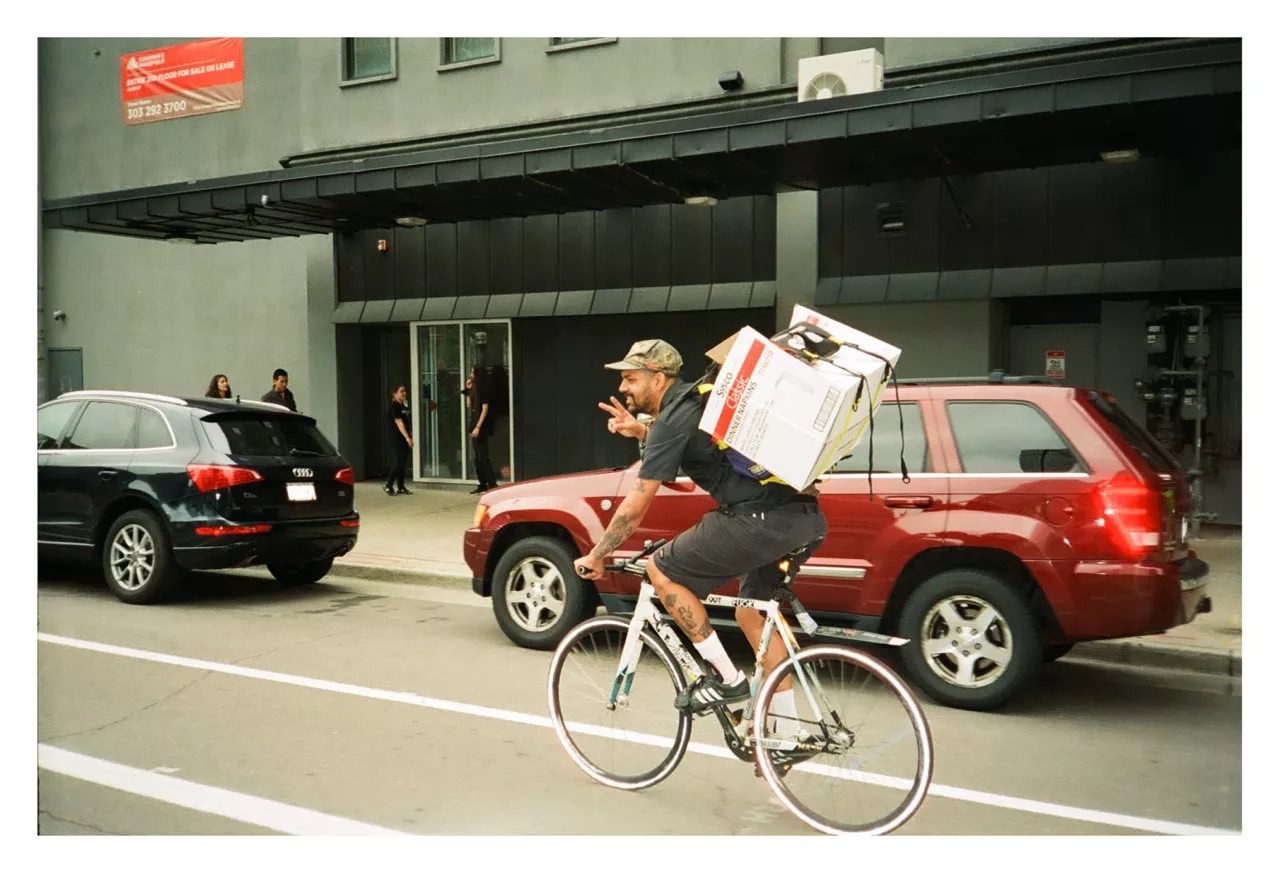 Before switching to Denver Boulder Couriers, Cass would transport forty or fifty prescriptions a day during the pandemic. Mena still does a lot of medical work. He takes prescription orders to pharmacies and transports scans and blood samples from one medical professional to another; sometimes he even takes bills from Denver Health to people’s homes. Before the pandemic, about 20 percent of his work was medical; today it’s about 90 percent, he says.