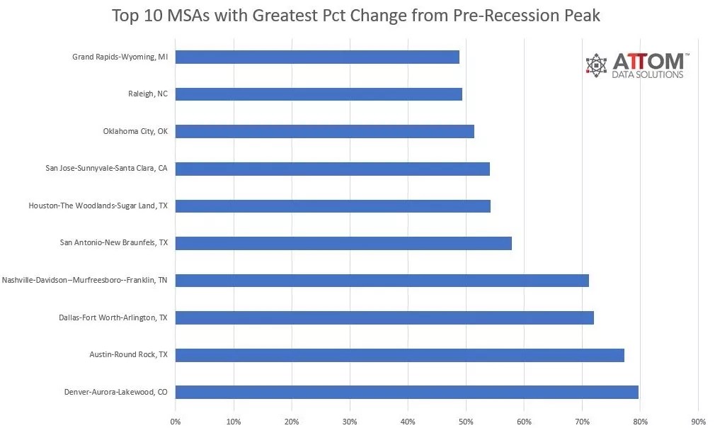 Here’s an ATTOM graphic that shows the ten MSAs with a population greater than one million that have seen the largest median percentage price rises since before the recession, with Denver leading the pack.