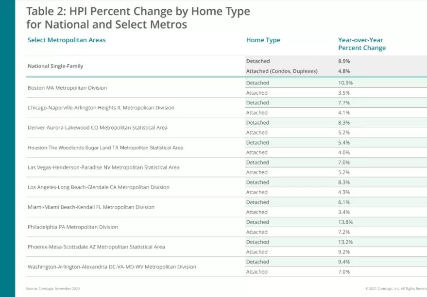COVID-19 could play a significant role in the disparity between detached and attached homes; buyers aren’t as willing to take on shared spaces that bring close contact with neighbors in corridors, stairwells and elevators for additional room. This phenomenon has been observed across the U.S. since the start of the pandemic, Nothaft says.