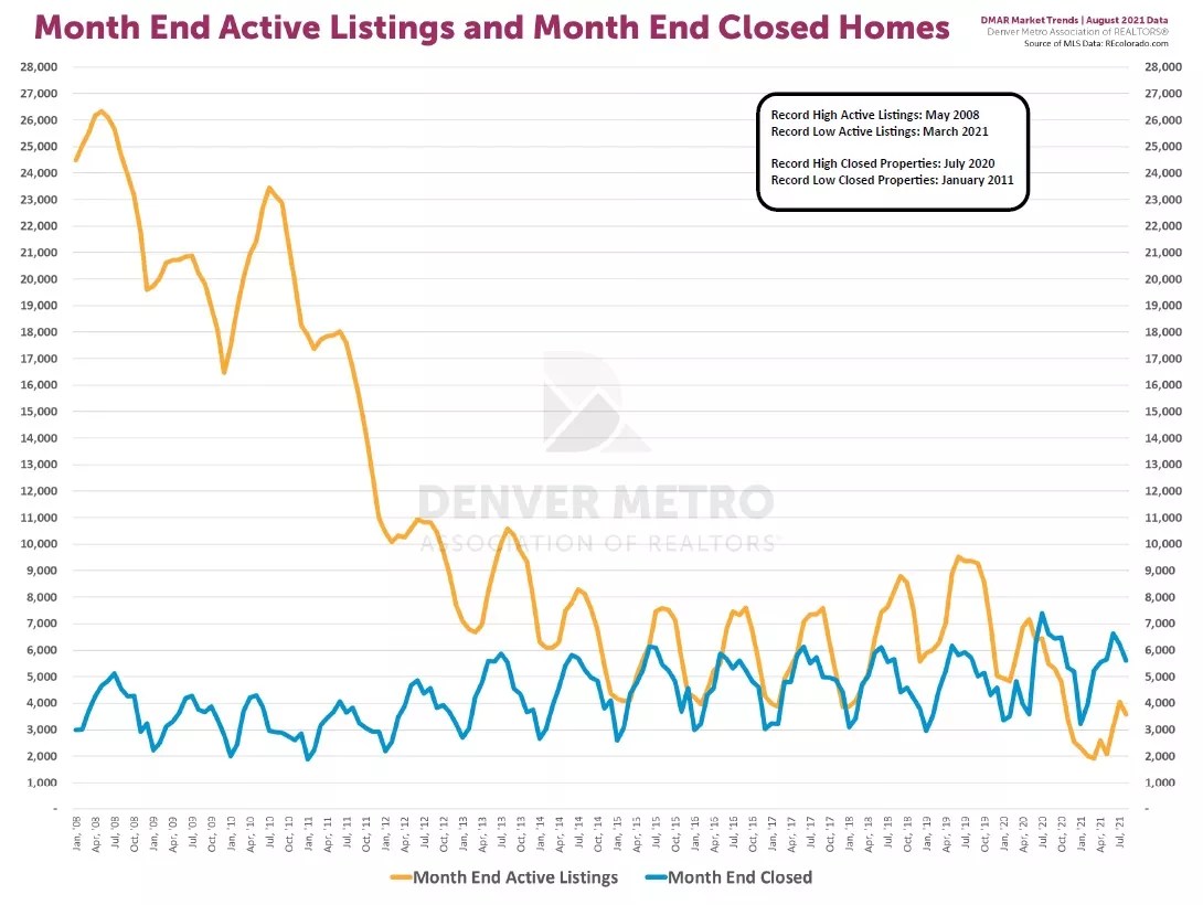 During 2021, the cost spikes in metro Denver have largely been driven by demand outstripping supply, and that phenomenon isn’t over. There were 2,469 active listings at the end of August, as compared to 2,878 at the end of July — a decrease of 14.21 percent. As summer slips into fall, the number of house hunters typically lessens — but if potential buyers who weren’t able to find anything over the summer remain on the lookout, prices could remain high longer.
