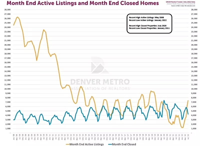 Such developments are relatively commonplace during the hottest days of summer along the Front Range, and the report’s authors see their return as evidence that the market is becoming more balanced. Nonetheless, a graphic from the report built with figures from January 2008 to July 2022 reveals that active listings at the end of the month hadn’t exceeded the closings total in two years…until now.