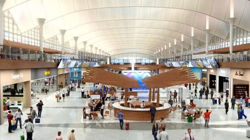 2. Welcome to Denver. After exiting the train, take a look at the Great Hall under the iconic tent roof before grabbing your bag. Now imagine it after a $1.8 billion renovation. Don’t miss the inlaid floor: That art piece by Jaune Quick-to-See Smith and Ken Iwamasa is definitely going, but imagine how much space that will free up for T-shirt shops.