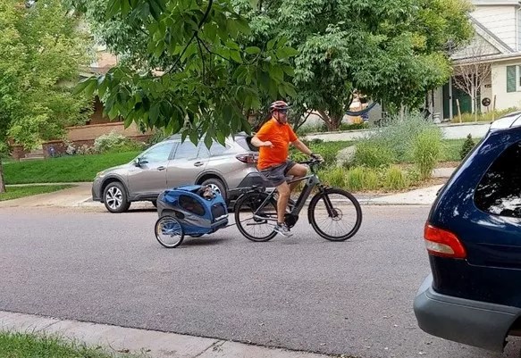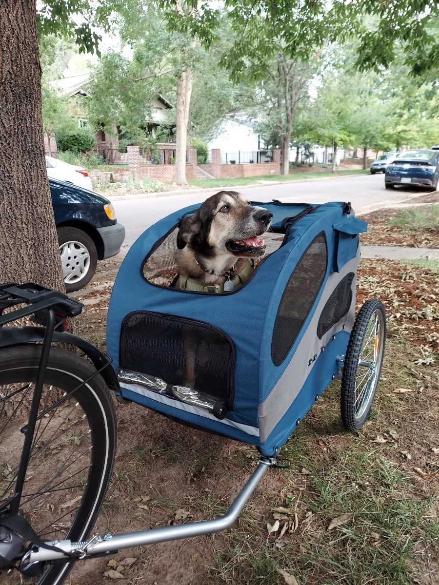 In early August, Wolf and Caesar started traveling all around Denver using the e-bike and doggy trailer. They biked on streets and in parks, visiting friends and hitting up brewpubs.
