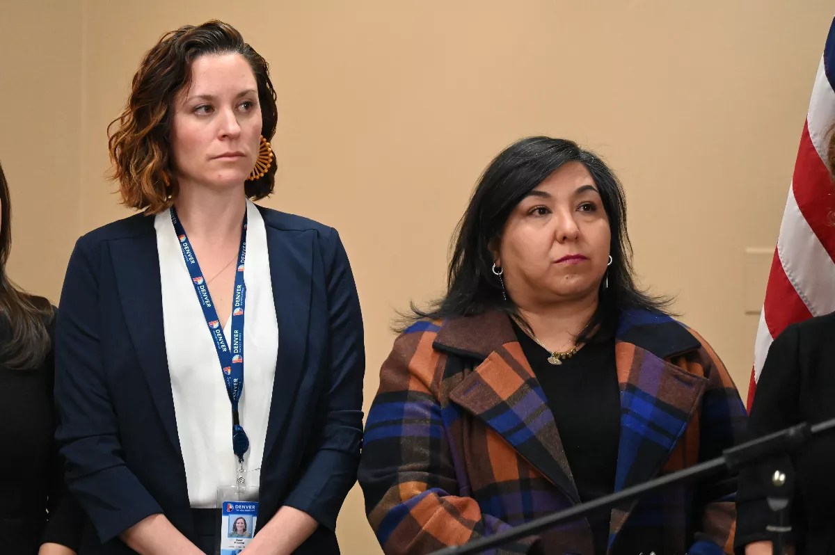 Denver’s first Newcomer Program director, Sarah Plastino, stands next to Denver City Council President Jamie Torres as Mayor Johnston details his migrant response strategy.