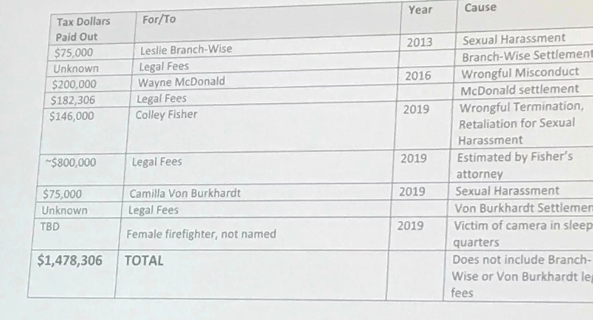 To illustrate her point, Giellis spoke beside a graphic showing settlement amounts paid out during Hancock’s years in office. Items referenced the likes of Denver police officer Leslie Branch-Wise, whom Hancock admitted to inappropriately texting when she was on his security detail during his first term. Also cited was ex-Hancock pal Wayne McDonald, whose firing for alleged sexual harassment led to a lawsuit that ended with a city payout of $200,000.
