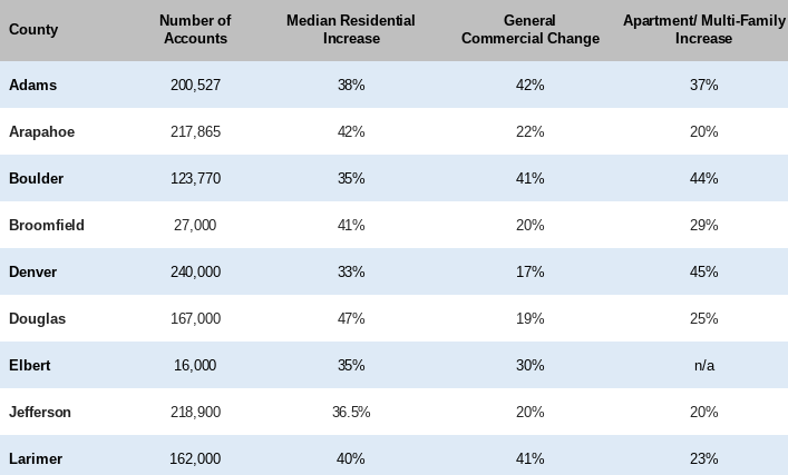 Larimer County saw a 40 percent median residential increase, Adams came in at 38 percent, Boulder at 35 percent, and Elbert at 35 percent.
