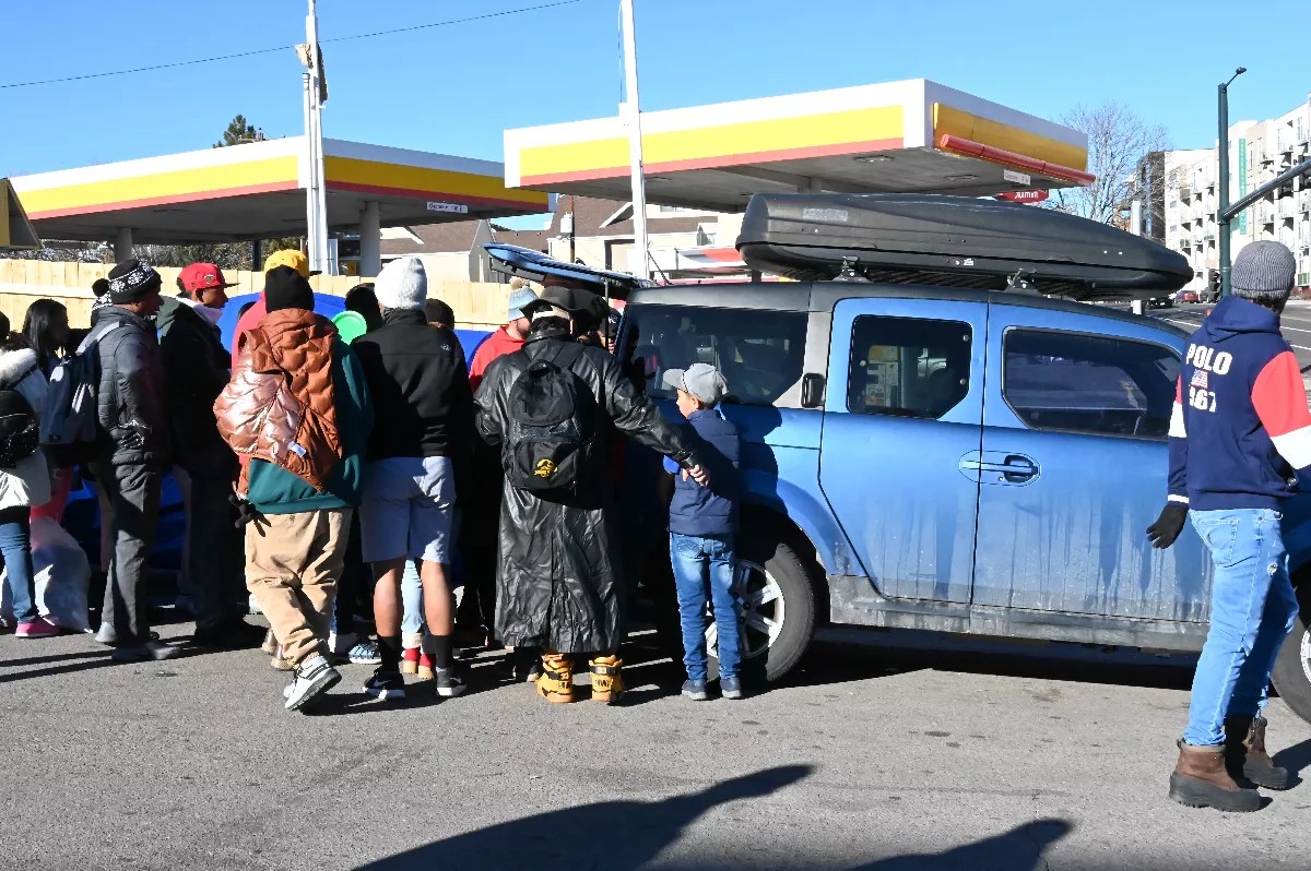 About a dozen migrants flock around a truck that stopped by the encampment at West 27th Avenue to hand out tacos.