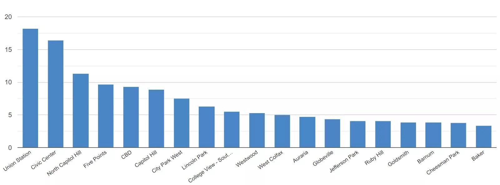 During the two-week period from July 2 to July 16, the section of Mile High City that registered the most violent crime was Union Station, which isn’t an official Denver neighborhood but is tracked by the DPD, with 18.2 offenses per square mile. Civic Center and North Capitol Hill followed, with 16.4 and 11.3 offenses respectively, while Globeville clocked in with 4.4 offenses per square mile.