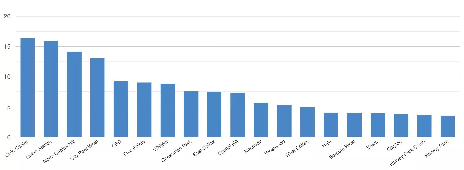 During the two-week period from September 19 to October 3, the two areas with the most violent crime were Civic Center (16.4 offenses per square mile) and Union Station (15.9). Both were also atop the violent-crimes roster for the period of July 2-16, but in reverse order, and their totals were lower then: Union Station notched 18.2 offenses per square mile, while Civic Center recorded 16.4. Union Station was also the area with the most property crimes from September 19-October 3, with 100.2 offenses per square mile — considerably lower than the 123 offenses documented for the Central Business District, which topped that category from July 2-16.