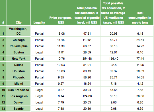 While much of the list’s order correlates with population – New York, Los Angeles, Chicago, Houston and Phoenix are the five biggest cities in the country – the average price per gram was noticeably lower in Denver and Seattle, which have both allowed retail sales since 2014. The study also estimated Denver’s projected revenue, but it didn’t need to, because Denver has collected actual cannabis tax revenue figures since 2014.