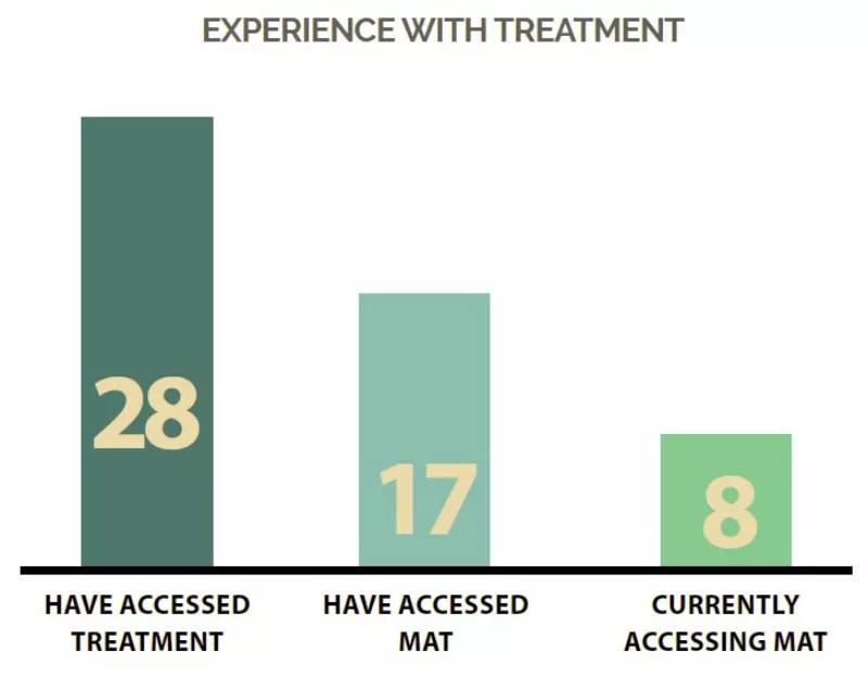 This graphic depicts the number of the thirty report participants who’ve tried to get treatment for their addiction. “MAT” stands for “medication-assisted treatment.”