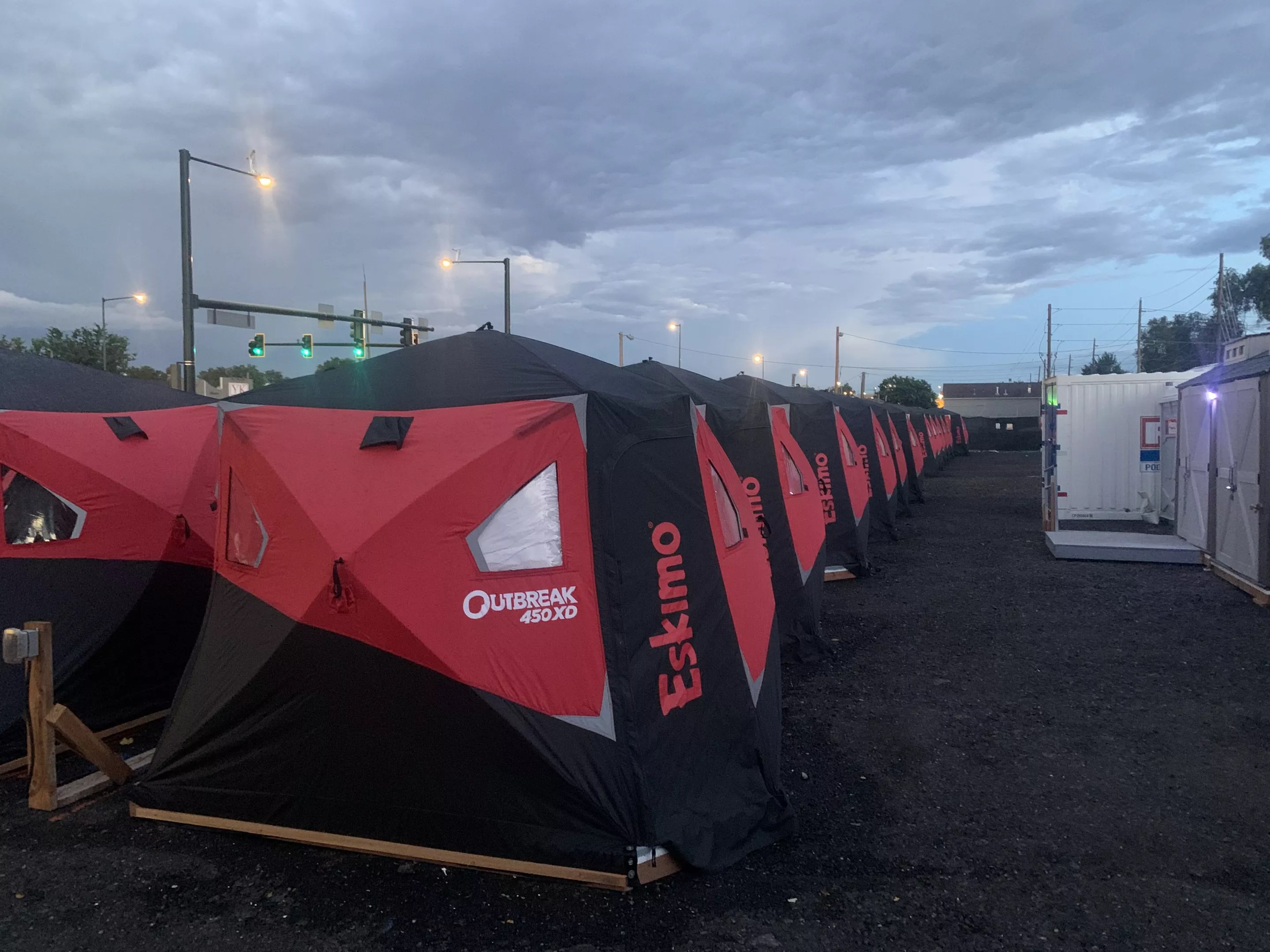 Crafted by Pallet, a company in Washington state, the shelter is made of pre-fabricated panels that are fairly easy to put together in an hour or two. The resulting structure can harbor people after natural disasters, as well as individuals experiencing homelessness. The one that I stayed in had a vaulted nine-foot ceiling, four windows, a bed with a mattress and a door that locked. It also had an air conditioner, a heater, a light and electrical outlets. Five of these pallet shelters are now set up at the new safe-camping site in Barnum run by the Colorado Village Collaborative and the St. Francis Center; there are also dozens of ice-fishing tents.