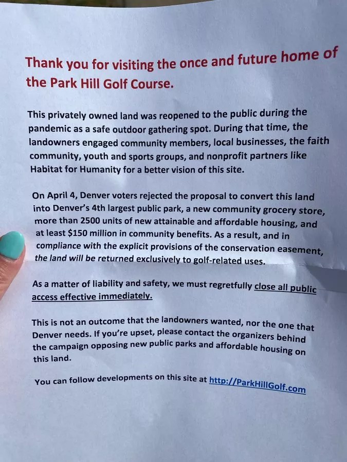 “On April 4, Denver voters rejected the proposal to convert this land into Denver’s 4th largest public park, a new community grocery store, more than 2500 units of new attainable and affordable housing, and at least $150 million in community benefits,” the fliers read. “As a matter of liability and safety, we must regretfully close all public access effective immediately.”
