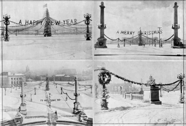 By 1919, the official city electrician, John Malpiede, had caught the fever and replaced the lights in Civic Center Park with colored globes of red and green for the holidays. The next year, he put an illuminated Christmas tree in front of the State Capitol. “Six years ago,” Wayne reported in 1926, “when The Post sponsored a program of outdoor Christmas lighting to link Denver with a joyous expression of Christmas cheer and good will, we little thought it would reach such dimensions. … In 1925, Denver won title as the Christmas city of the world.”