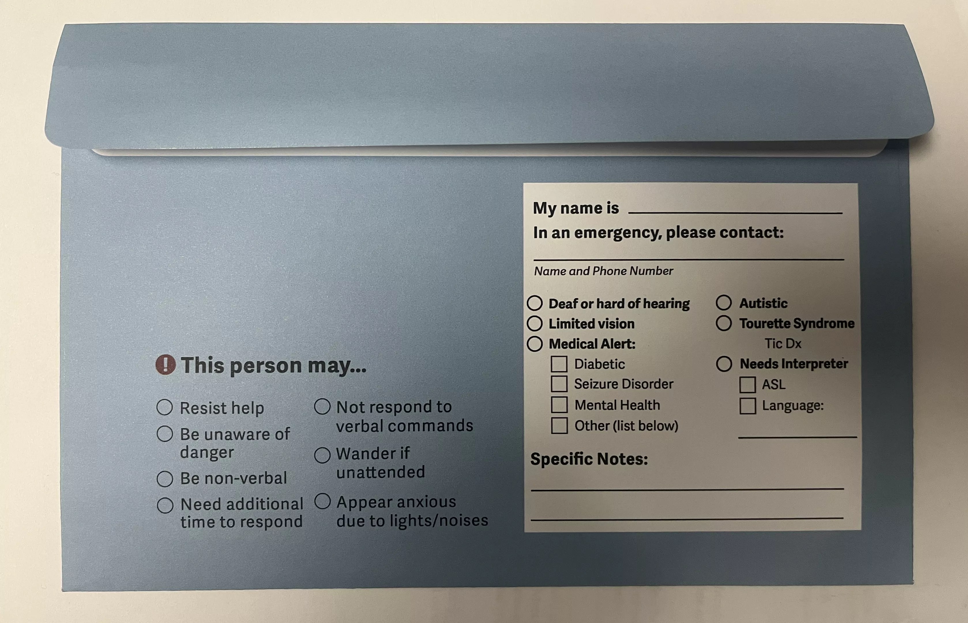 The programs are meant to improve interactions between officers and people with invisible disabilities that might make communication difficult. The namesake blue envelopes contain information about the person’s condition — such as explaining that they have autism, Tourette syndrome or are deaf — and how that might impact their behavior or needs. Participants fill out the envelope ahead of time and present it to officers during traffic stops or other police interactions.