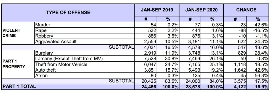 The crime statistic comparisons currently available on the DPD’s website end in 2020. But they reveal significant increases in most categories of violent crime and property crime from January to September of that year, compared to the same period in 2019: