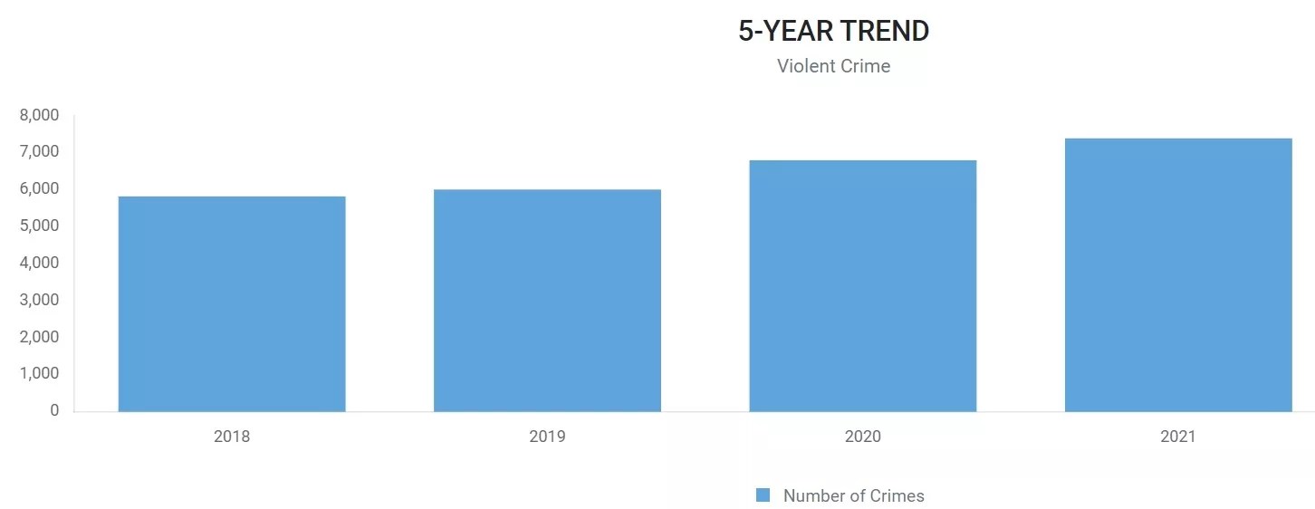The Colorado Bureau of Investigation’s crime-data site goes further, offering annual comparisons through 2021. This graphic reveals that violent crime in Denver continued to rise through that year as well: