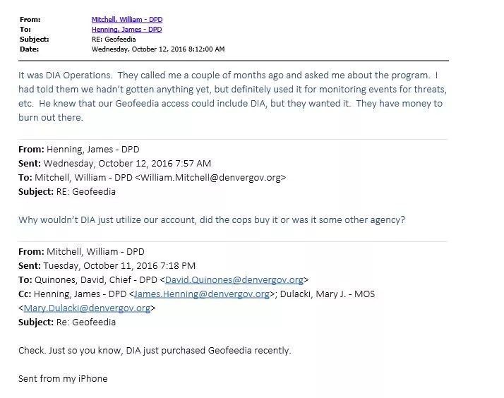 The DPD wasn’t the only city agency affected. Denver International Airport had pursued its own Geofeedia subscription. In an October 12 e-mail, Mitchell told Lieutenant James Henning: “DIA operations…called me a couple of months ago and asked me about the program. I had told them we hadn’t gotten anything yet, but definitely used it for monitoring events for threats, etc. He knew that our Geofeedia access could include DIA, but they wanted it. They have money to burn out there.”