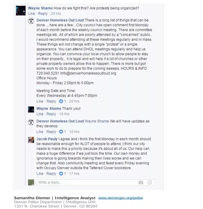“It does look like a few of them plan to march to the capitol. I will let Jay know as well,” she wrote, and followed up by including an additional screen shot from the Facebook page of Denver Homeless Out Loud.