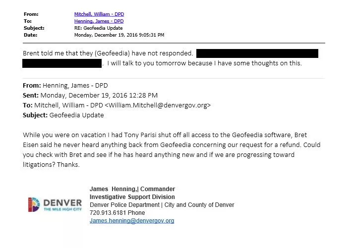 In e-mails obtained by Westword, members of DPD’s Intelligence Unit discussed canceling the department’s Geofeedia subscription. On October 27, Mitchell sent an e-mail to many members of the police department who had been Geofeedia users: