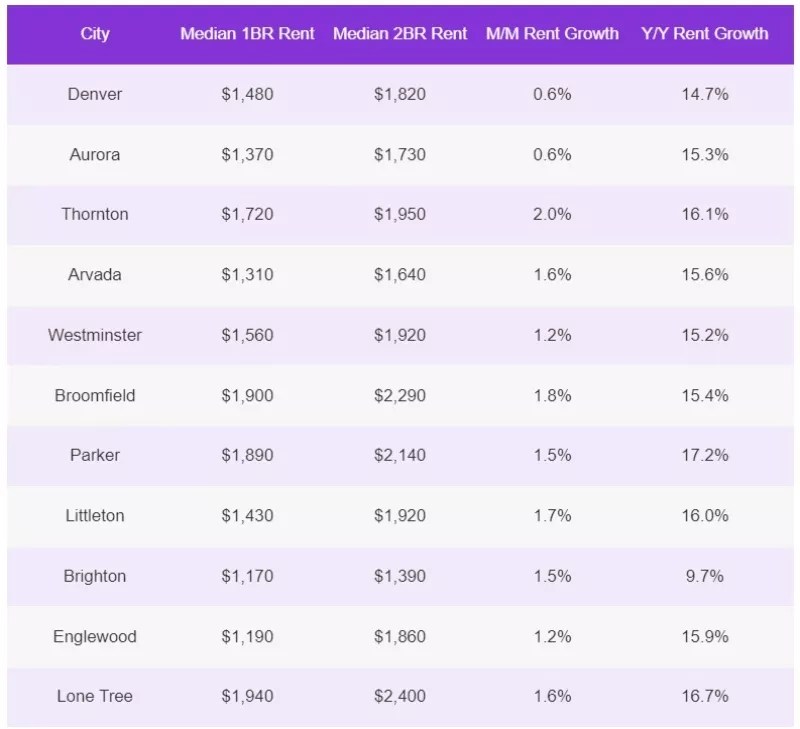 Still, Denver’s two-bedroom rate in March was lower than in seven suburbs. Last month, two-bedroom prices exceeded Denver’s in Englewood ($1,860), Littleton and Westminster (both $1,920), Thornton ($1,950), Parker ($2,140), Broomfield ($2,290) and Lone Tree ($2,400).