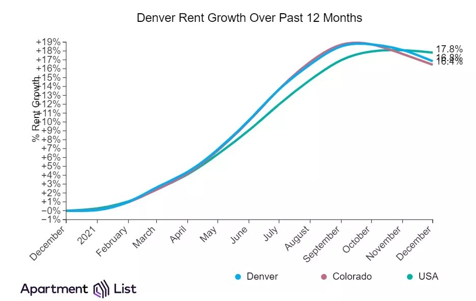 If it’s any consolation, the average rent increase nationally for this period is 17.8 percent. This graphic compares rent in Denver to prices in Colorado as a whole and the U.S. generally.