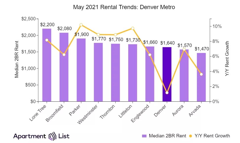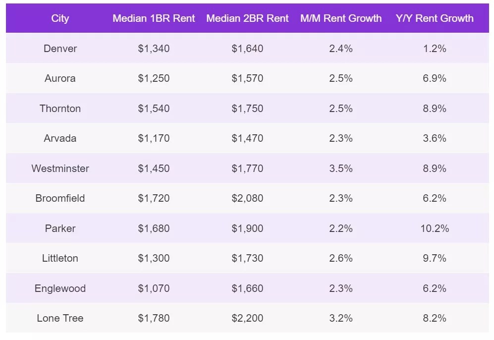 The higher rents in the Denver suburbs are further detailed in the following graphic, which shows median one-bedroom and two-bedroom rents along with both month-over-month and year-over-year rent growth.