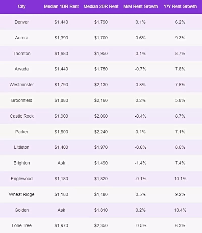 The August rent hikes in the twelve other Denver-area cities ranged from 6.3 percent in Lone Tree to 10.4 percent in Golden. And six saw month-to-month declines: Englewood (-0.1 percent), Castle Rock (-0.4 percent), Lone Tree (-0.5 percent), Littleton (-0.6 percent), Arvada (-0.7 percent) and Brighton (-1.4 percent).