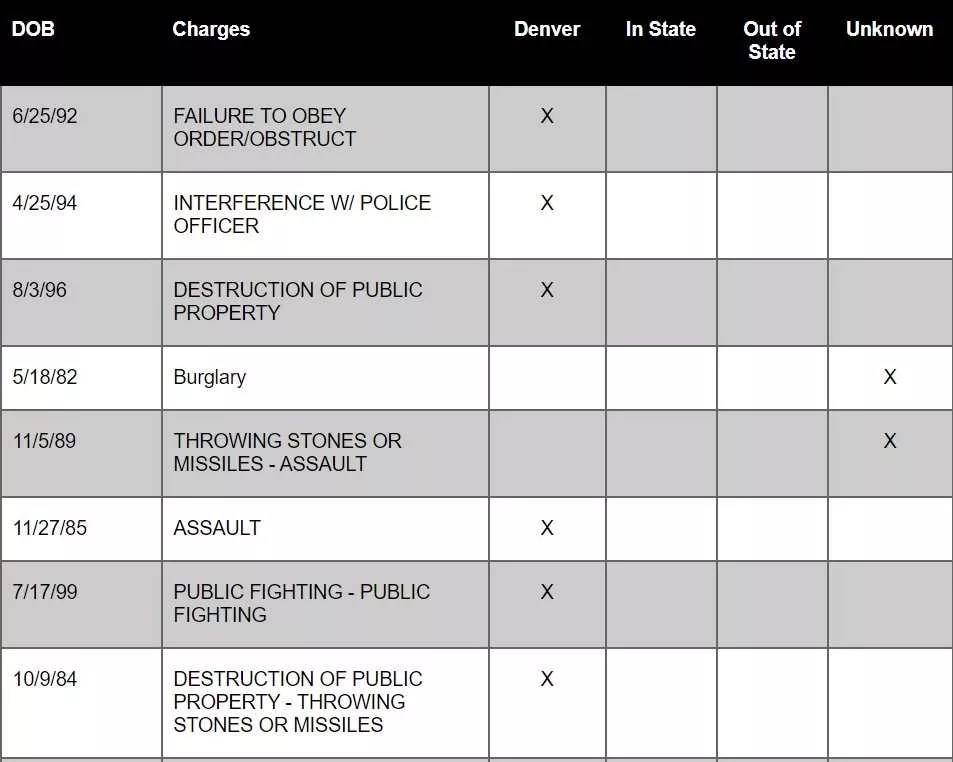 Late on the afternoon of June 1, the Denver Police Department released the most detailed accounting to date of the 284 protest-related busts between May 28, when demonstrations began, and May 31. In addition to mug shots, the DPD shared basic information about each arrest. On May 28 and May 29, when just 23 people total were booked, charges are more specific; among them are failure to obey an order, throwing stones or missiles, burglary and more. The next two days, most involve violations of a curfew put in place by Mayor Michael Hancock, but there are exceptions, mostly for alleged use of dangerous weapons.