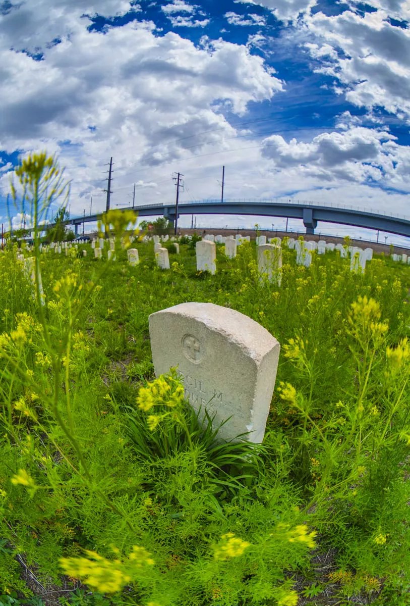 No matter the season, off in the distance looms the smokestack of the Cherokee Generating Station as the stench rolls in from the largest wastewater treatment facility in the Rockies, just a block away, and tanker trucks lumber to and from Suncor’s refinery, right across the street. Good luck finding much in the way of tree cover to escape the glare of the sun. This is what the Rocky Mountain News once called “one of the loveliest cemeteries in the country”?