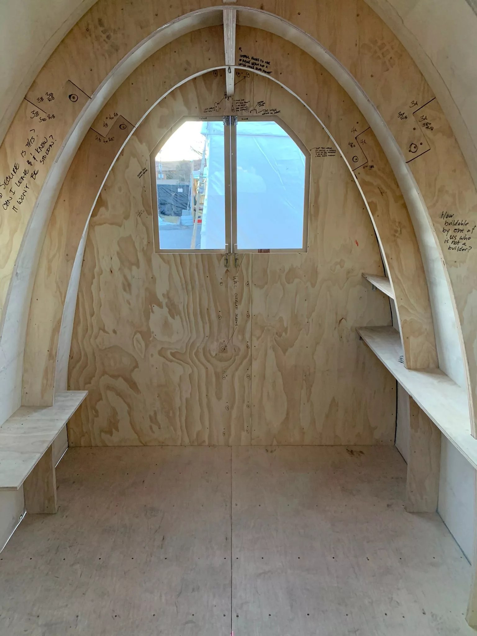 The CU Denver students designed the structure to be more comfortable than the tents, which lack insulation. The canvas that wraps around the wooden skeleton of the prototype has a layer of insulation, which helps retain heat during cold winter nights; the wood also retains heat.