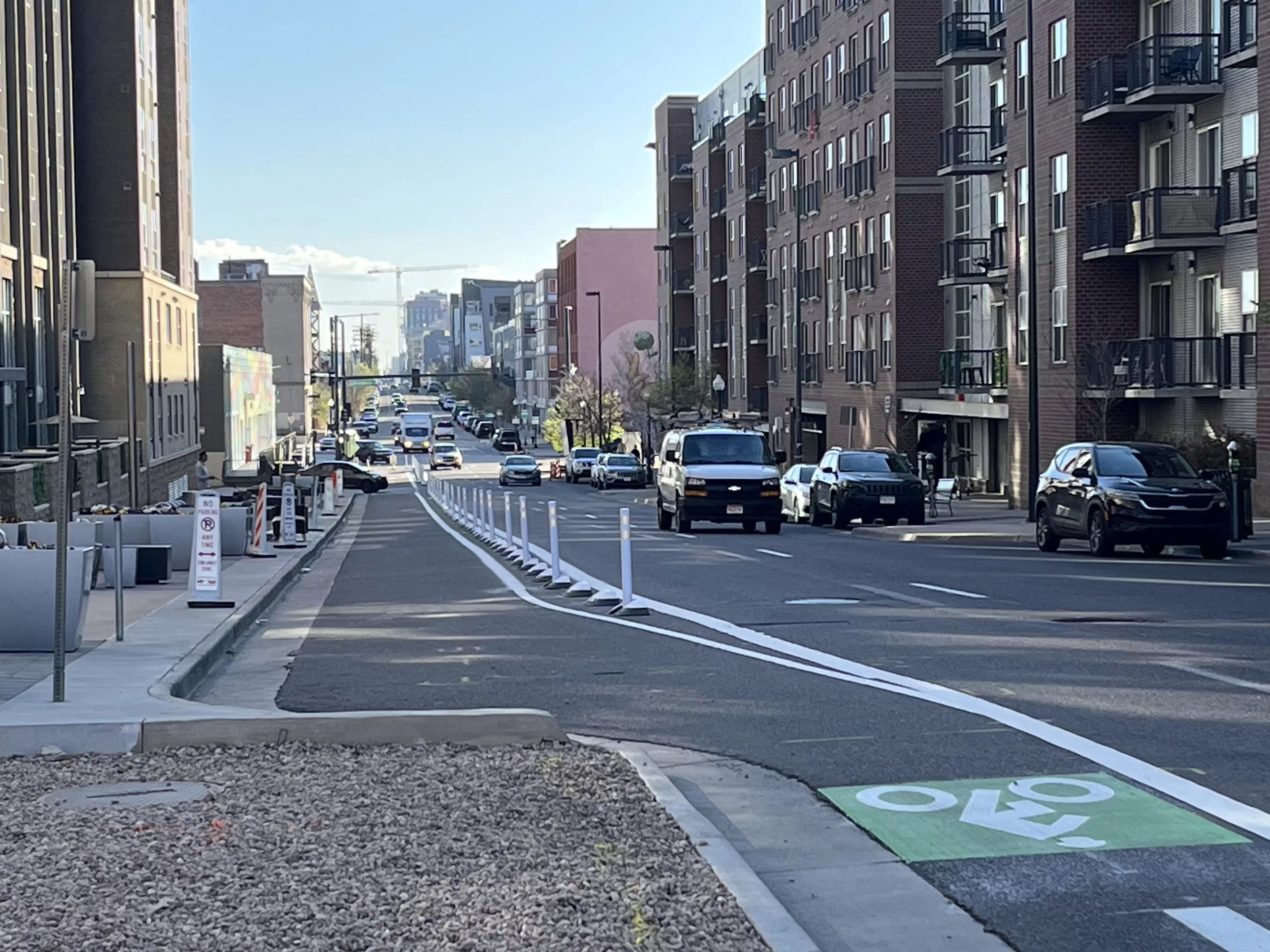 The new protected bike lanes will stretch from the Cherry Creek trail to Broadway along Market and Blake — adding a total of two miles of protected bike-lane infrastructure to downtown, according to DOTI. In addition to safety improvements, DOTI says the bike lanes “will provide dedicated space on the street for people to bike and scooter, reducing concerns about scooter riding on sidewalks and improving the environment for people walking.”