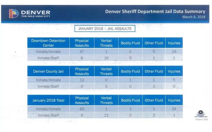 The most interesting revelation from Firman’s discussion of reforms was new data compiled by the department that breaks down the numbers and types of assaults occurring in Denver jails. Firman said that the department had not been keeping data that differentiated types of assaults, and a team known as the Data Science Unit had to read hundreds of incident reports to compile the numbers.