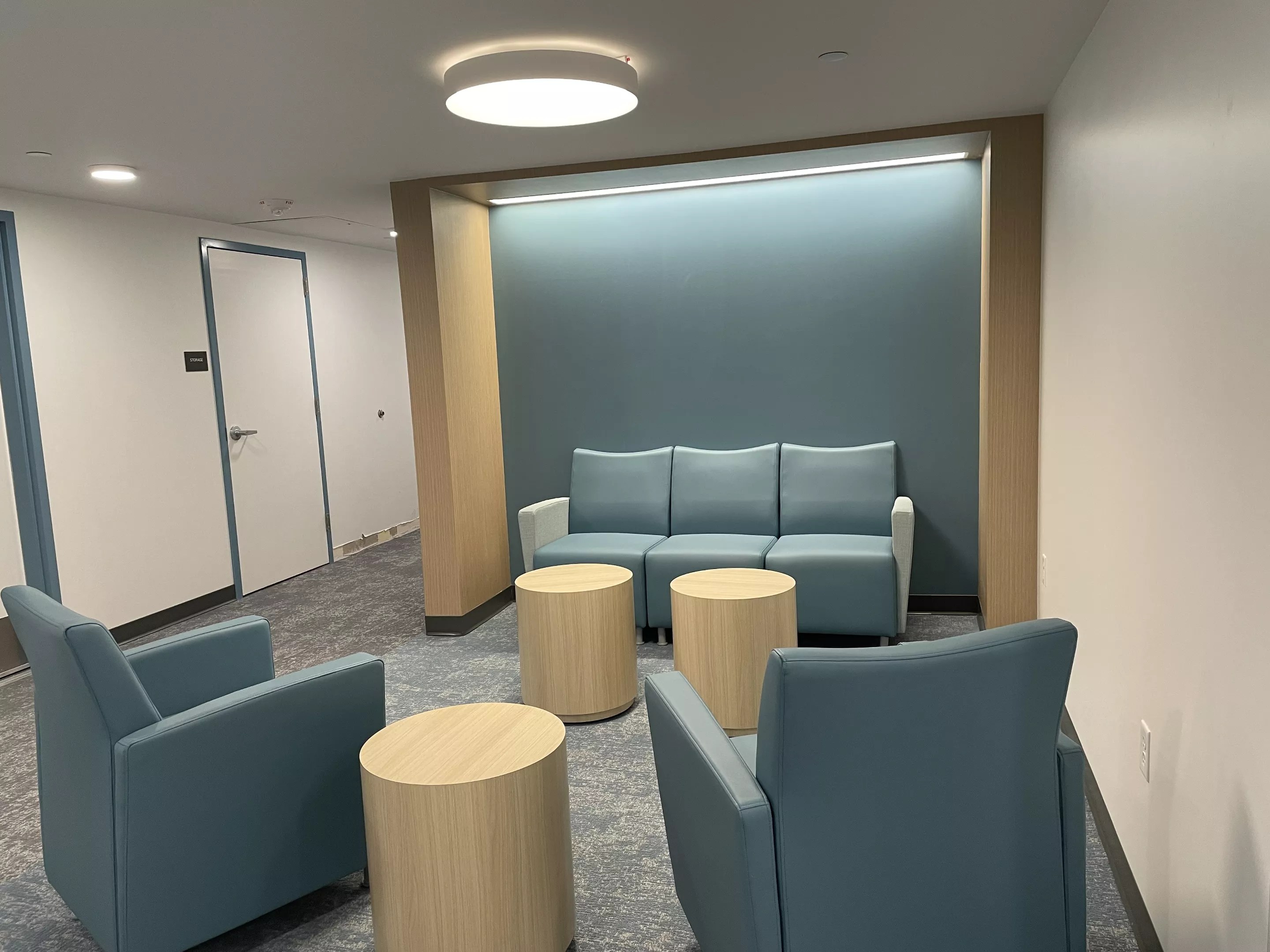 Each floor is color-coded and has its own Denver landmark theme. One floor’s color is red and its theme is Red Rocks. One is blue with a Denver Art Museum theme. The Denver Health floor is yellow with a Union Station motif.