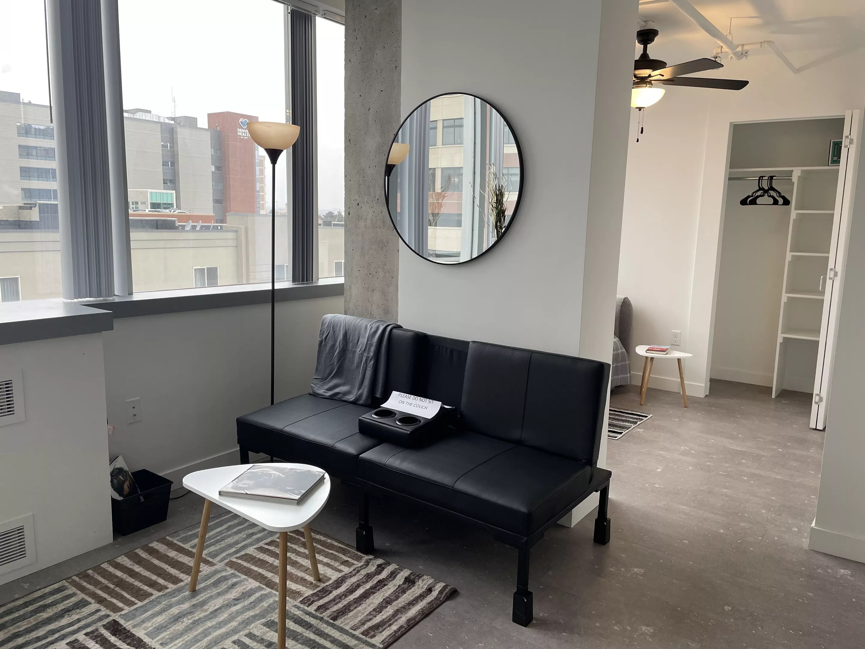 The building is designed with wide hallways for accessibility. It has concrete floors and large windows in the units, which are mainly studios and one-bedrooms. Each floor has a small communal living area, and residents also get access to a gym and community room on the first floor.